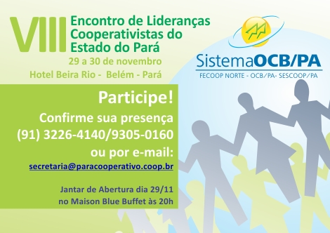 O VIII Encontro de Lideranças do Cooperativismo Paraense acontecerá nos dias 29 e 30 de novembro, no Hotel Beira Rio, em Belém. No dia 29 de novembro, será realizado o Jantar de Confraternização das Cooperativas Paraenses, às 20h, no Maison Blue Buffet, localizado na Tv. Dr. Moraes 294, entre Braz de Aguiar e Gentil Bitencourt, bairro de Nazaré.